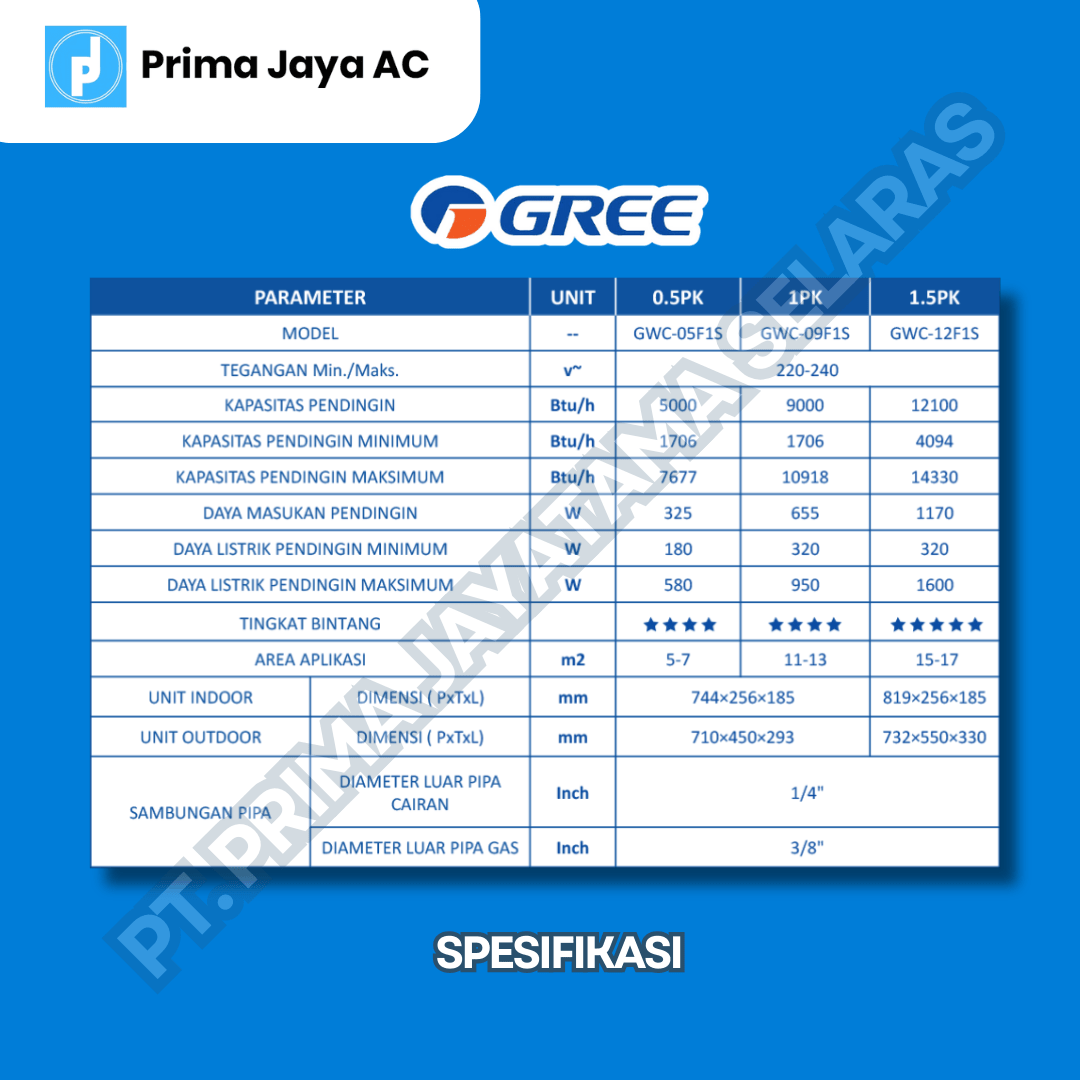 SPESIFIKASI GREE GWC-12F1S AC SPLIT 1,5 PK INVERTER